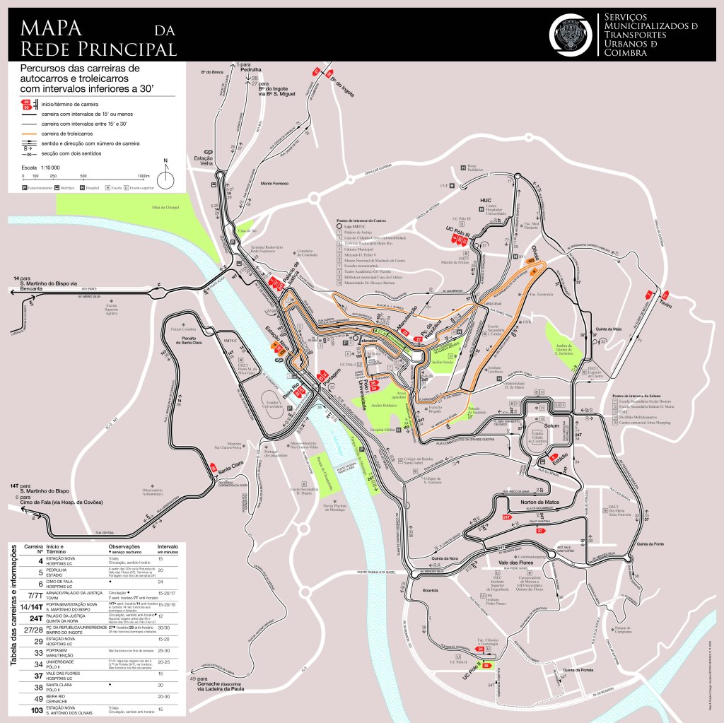 Map (unofficial) of the main urban bus and trackless trolleys network of the city of Coimbra.