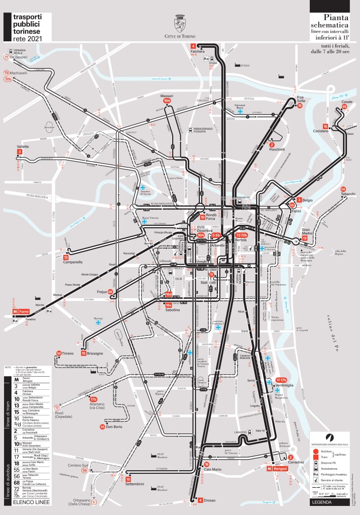 To stay focused on Turin, you can take a look at the current official system map, where there is only one thickness for all tram and bus routes; this was not the case in the Turin’s maps of the 1980s, which were clearer in many ways.
