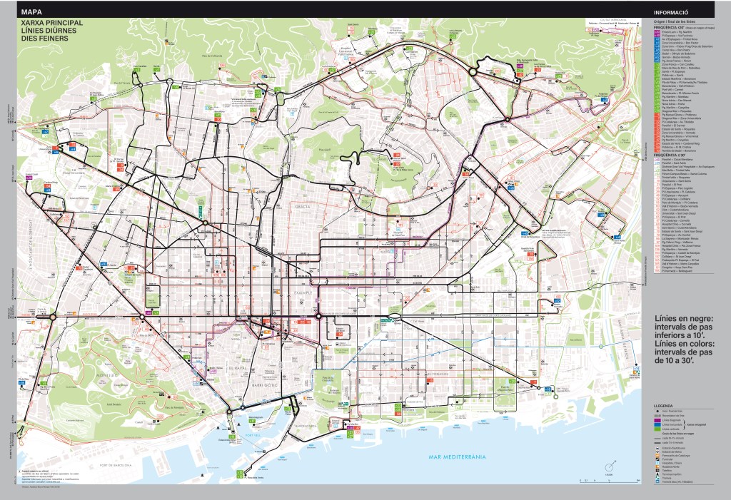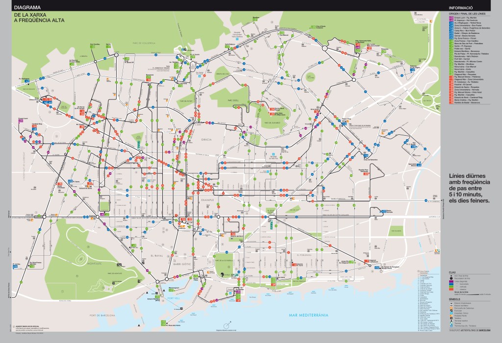 Here go the fruits of my latest and longest work in years: two maps, one depicting the main surface transit system “Mapa Xarxa Principal”of Barcelona and the other the high frequency surface system“Xarxa Freqüència Alta”of the same city.