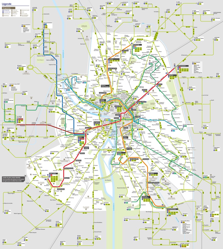 The relatedness between my map ― I call it “géo-schématique” in French ― and the current “plan général” is obvious because my map has been revised and updated in-house by Tisseo (commercial name of the network) since September 2016**, the first time the network decided to implement it, three years after I sent my latest draft. This “plan général” is displayed at every bus stop equipped (nearly 3000) and available in pdf online, but not issued in printed form to the customers (a totally different map is issued as a pocket map).