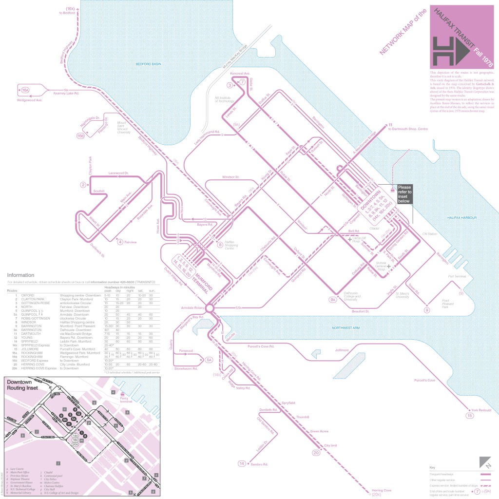 This route diagram of the Halifax Transit network is based on the map conceived by Gottschalk & Ash, issued in 1970. The identity (logotype shown upper right) of the then Halifax Transit Corporation was designed by the same studio.