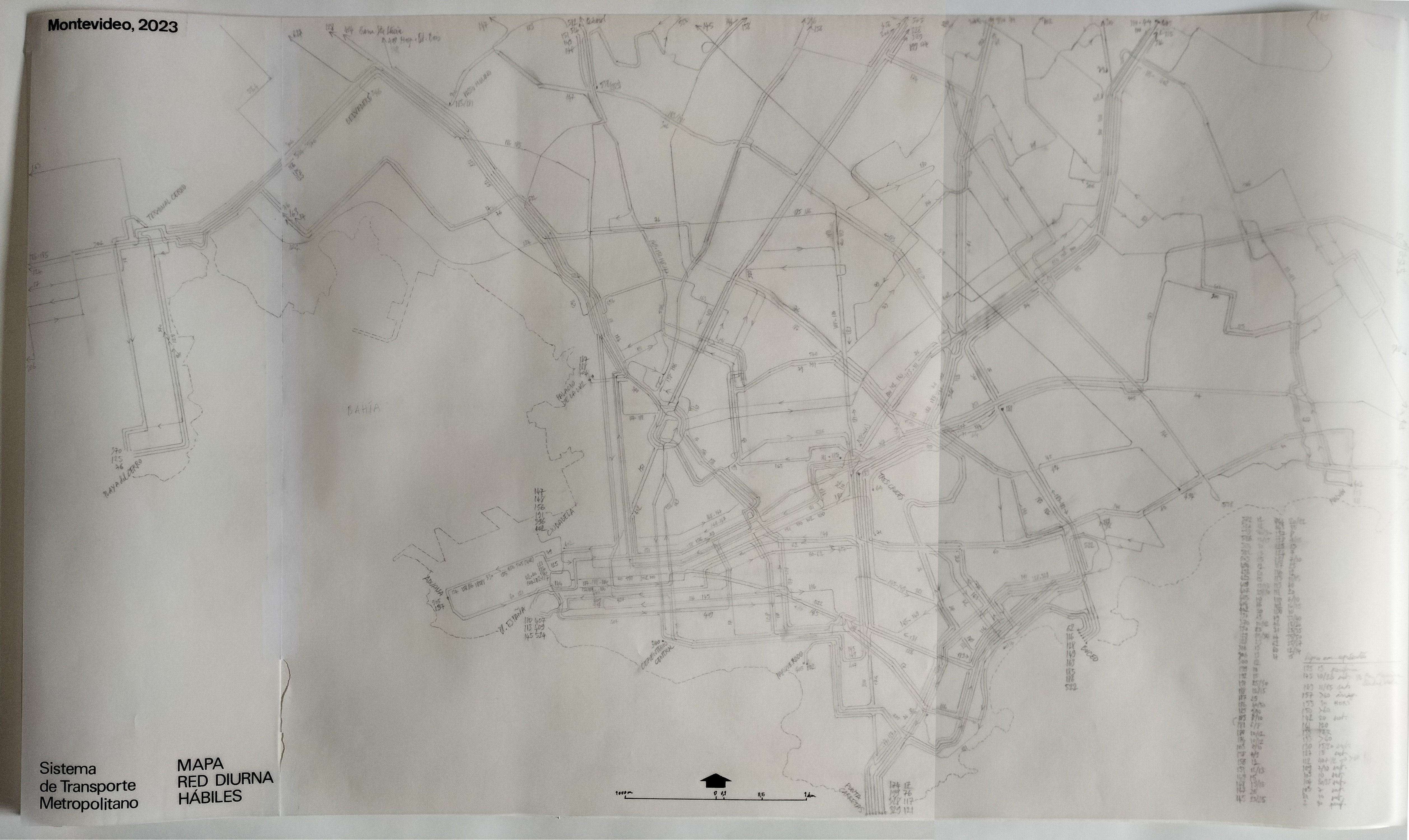 Une fois n’est pas coutume, le plan que je présente est un brouillon, de 73 × 42 cm (l.×H.), fait sur du papier calque, avec un crayon HB, une règle, et une simple carte des voies de la commune de Montevideo pour fond*. En ce qui concerne les services dépeints, j’ai consulté ligne par ligne le site du « Sistema de Transporte Metropolitano » (STM) de Montevideo, pour me figurer les parcours (aller et retour), leur fonctionnement (diurne, nocturne, semaine, jours fériés, etc.), ainsi que leurs fréquences. Ce réseau n’est actuellement constitué que de lignes d’autobus, mais un important réseau de trolleybus avait perduré jusqu’en 1992.