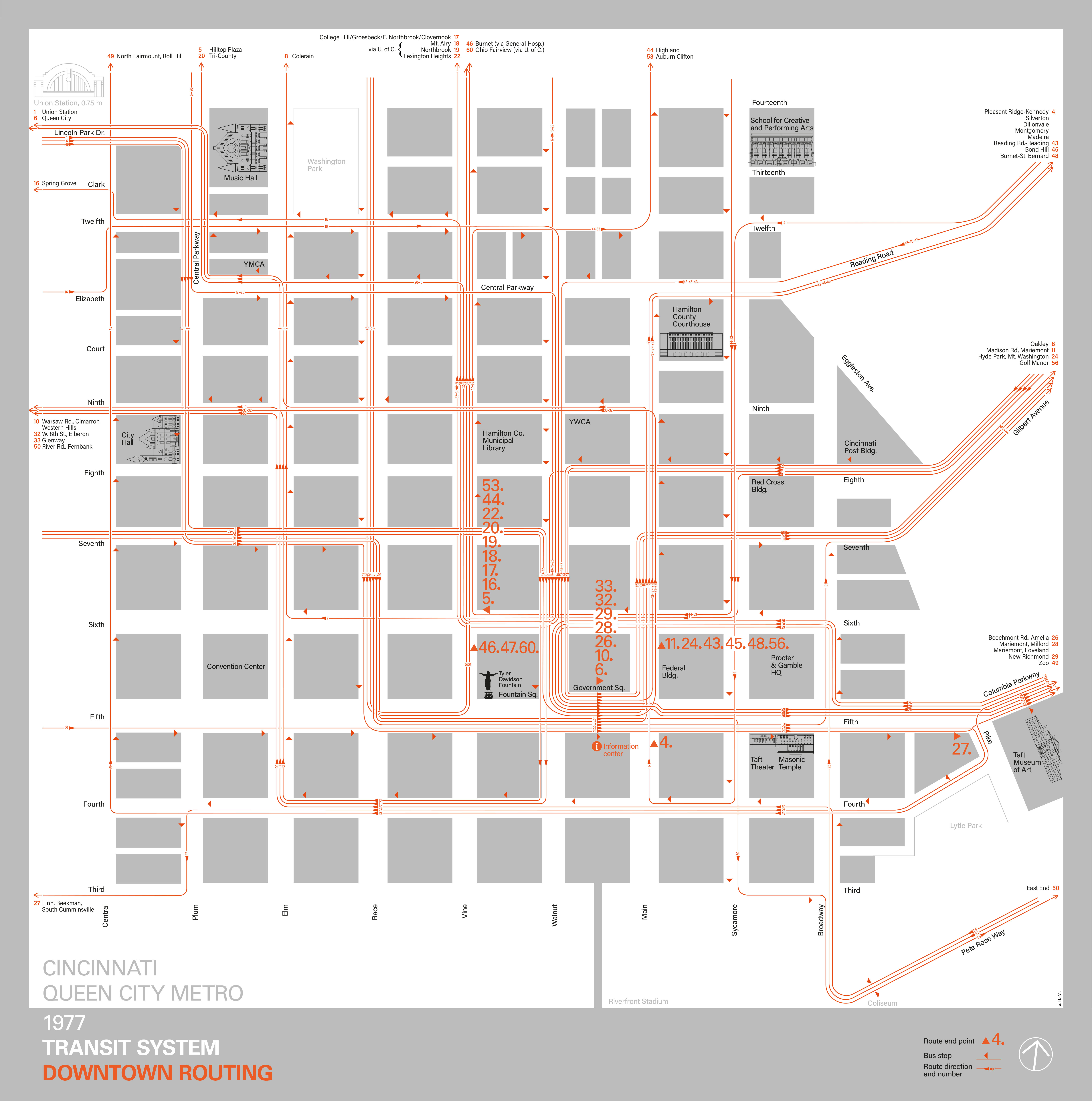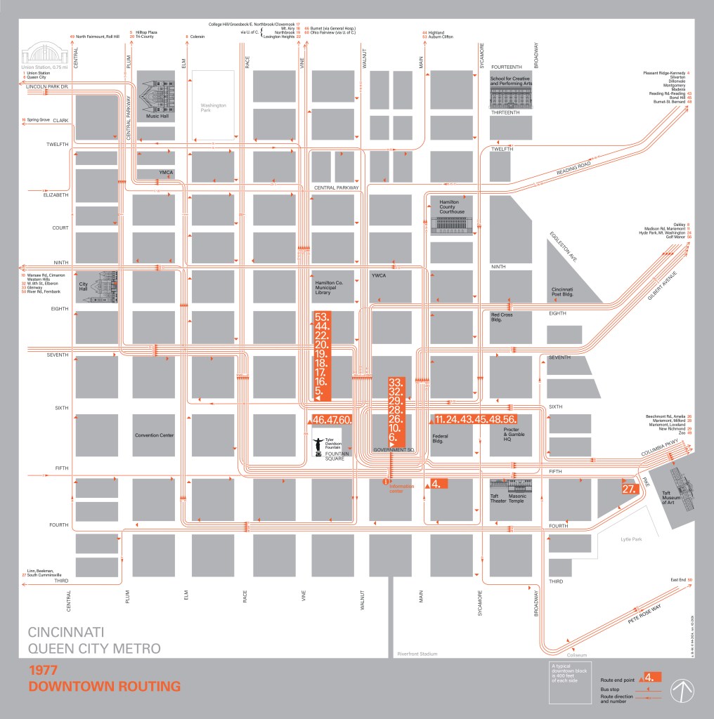 As I like to depict the flow of the different routes within this type of urban grid, here is the schematic map of Queen City Metro bus lines in the CBD of Cincinnati, in 1977.